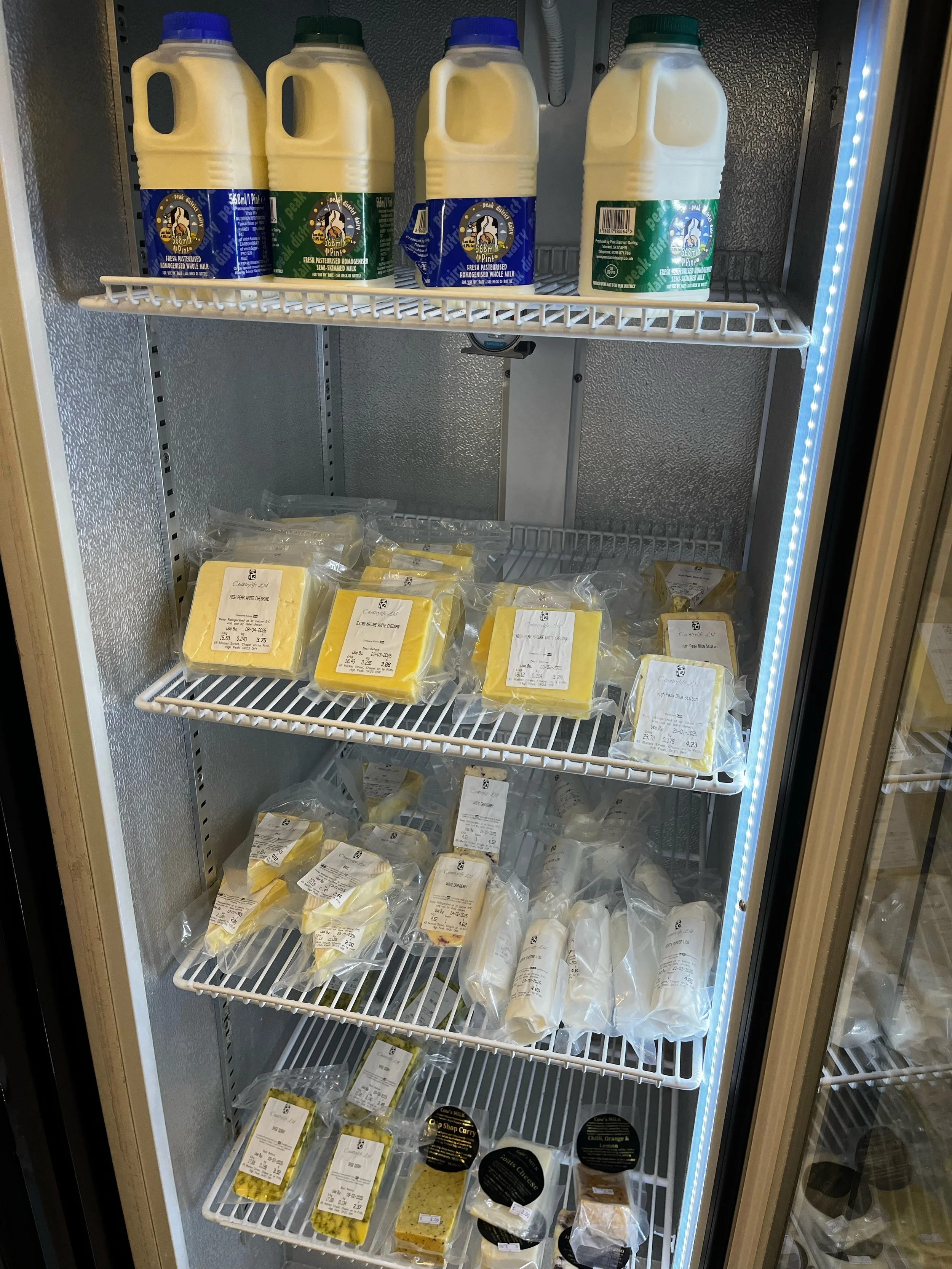 We have a varied selection of locally produced and sourced milk and cheese. Some of our flavours include: chip shop curry, white cranberry, chilli orange and lemon, and goat’s cheese!